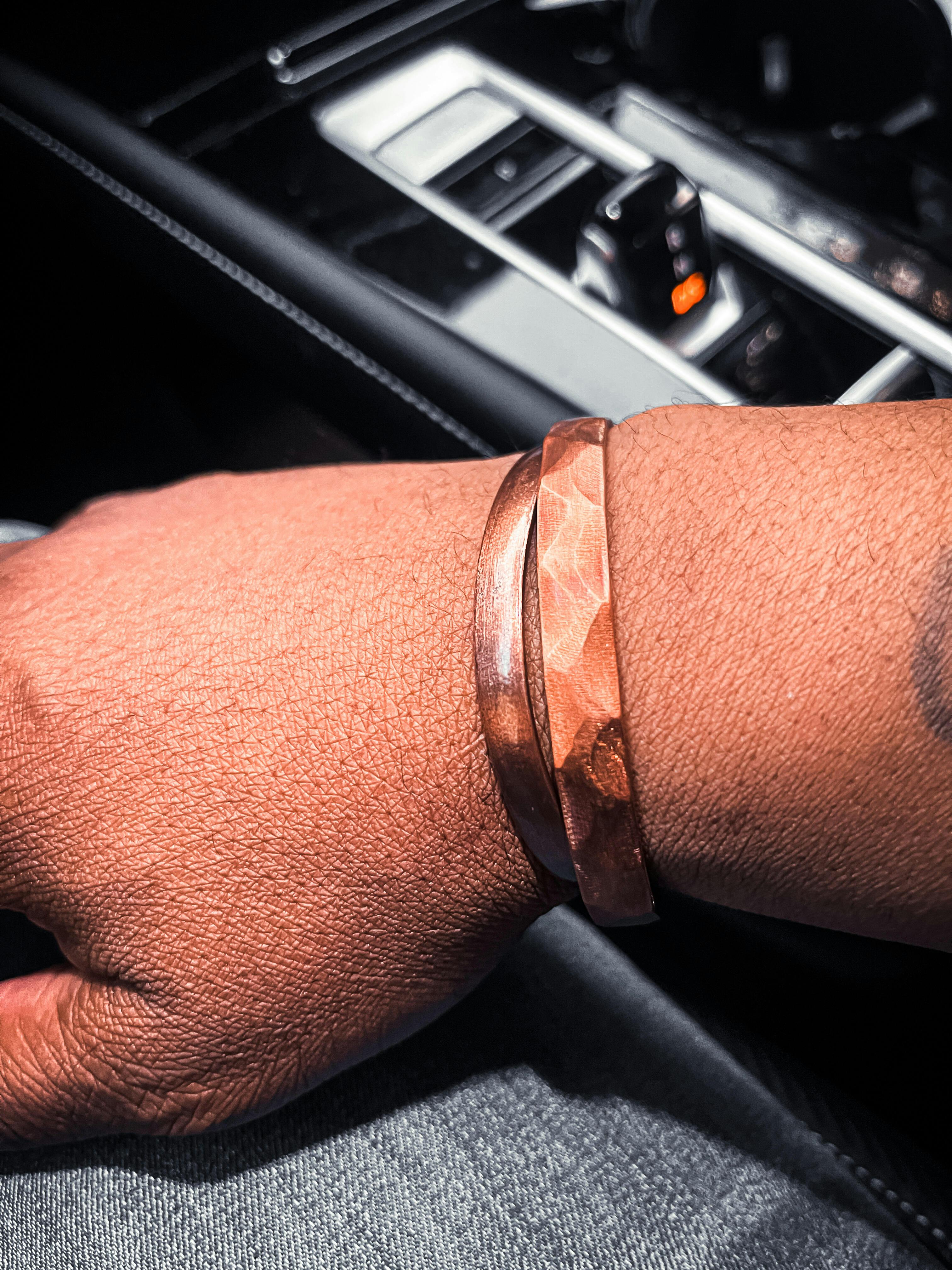 A Very Stylish hammered heirloom. The thick heavy pure copper bracelet sits low on your wrist so it will never get in the way of your shirt or coat sleeves. Bend to fit. Very High Quality for such an excellent price. A Saint Michaels Jewelry Exclusive.