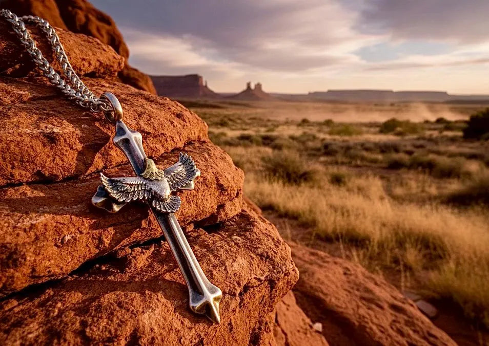 Cross - Super heavy 18g (.6 oz) of Pure Solid Sterling Silver S925 in an Eagle and Cross Western Style cross with Gold plated eagle head and Gold eagle badge charm on the back with an antique oxidized finish in the crevices. Very nicely pre-aged and antiqued especially around the eagle feathers. Large Heavy designed cross with big Western charm! Integrated bail allows a full view of the cross and an extra level of interest. This is a fabulously designed timeless keepsake. Stamped S925 on the back. The Cross measures 3 tall x 1 5/8 wide x 1/4 thick!! The value and beauty of this cross will ensure it is one of your most precious original family heirlooms!